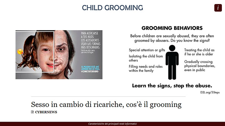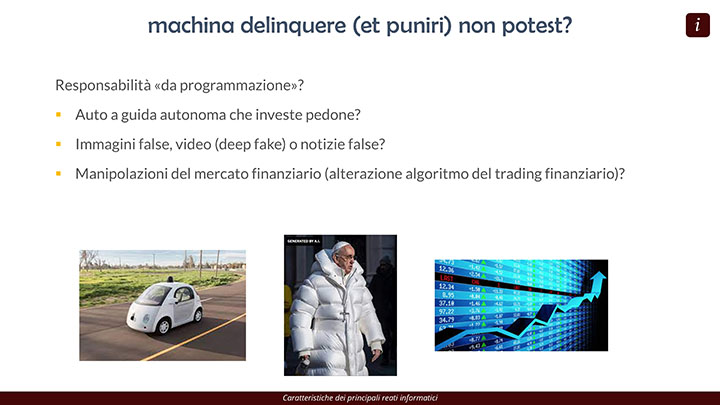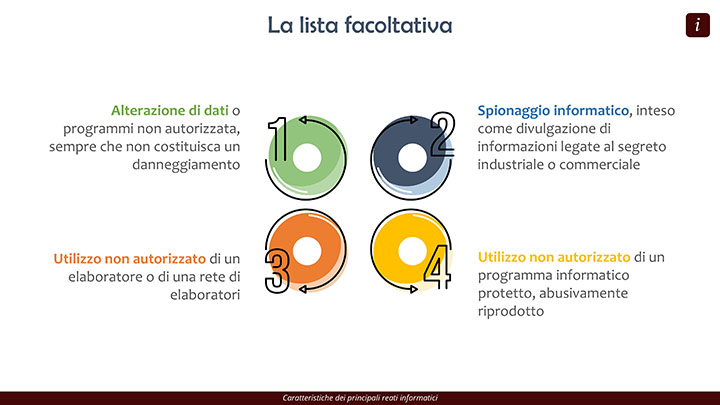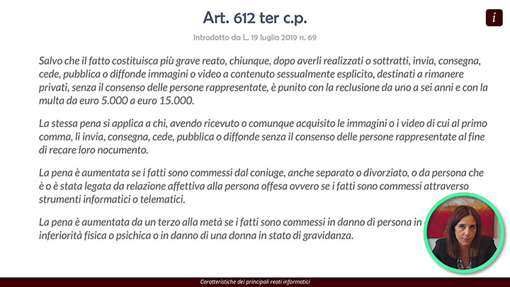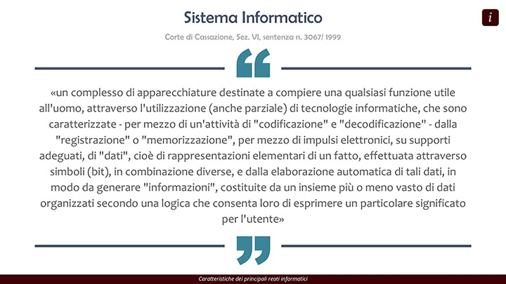 Il corso analizza i principali reati informatici come introdotti per legge e analizza le altre fattispecie di reato che hanno lo strumento informatico come mezzo per commettere il reato (cyber stalking, cyber laundering, diffamazione on line etc.).
