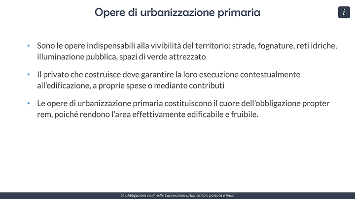 Il corso affronta il tema della natura e dei limiti della portata delle obbligazioni reali nelle convenzioni urbanistiche, offrendo spunti di riflessione (sia di diritto amministrativo, sia di diritto civile collegato al diritto amministrativo) tanto per chi redige convenzioni urbanistiche e/o contratti collegati, tanto per chi si trovi già nella fase patologica del rapporto contrattuale.
