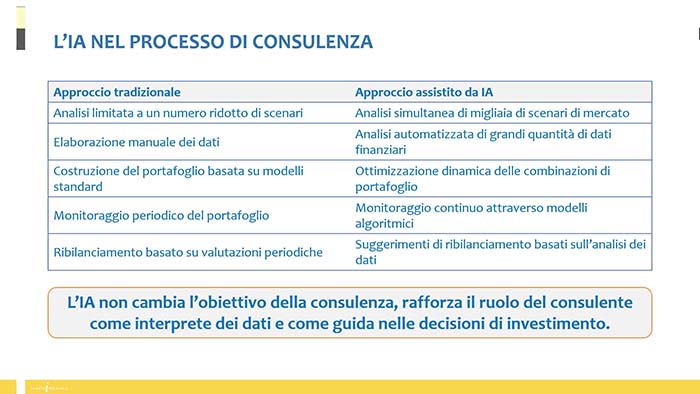 L’obiettivo è rafforzare il ruolo del consulente come mediatore tra persona e tecnologia, promuovendo decisioni sostenibili nel tempo e una relazione evoluta e “aumentata”, in linea con i principi di trasparenza, adeguatezza e tutela dell’investitore.