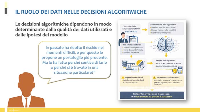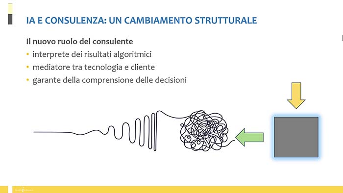 Il seminario è rivolto a consulenti con una conoscenza di base dell’IA e si concentra sullo sviluppo di competenze relazionali avanzate, finalizzate a tradurre i processi algoritmici in contenuti chiari, accessibili e coerenti con il profilo, le aspettative e la tolleranza al rischio del cliente.